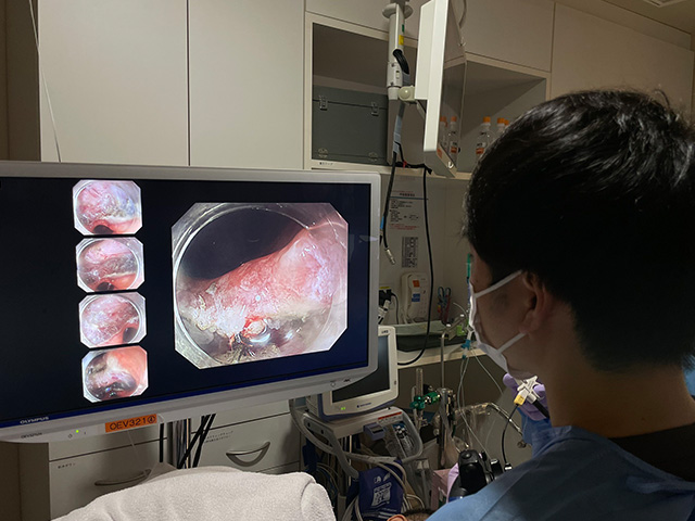上部消化管腫瘍の治療には主に内視鏡治療や全身化学療法(抗がん剤治療)があります。内視鏡治療では早期胃がん・食道がん・十二指腸腫瘍に対して積極的に治療を行っております。また、放射線治療後食道癌の患者さんを対象に、低侵襲な局所治療として光線力学療法(PDT)も行っております。